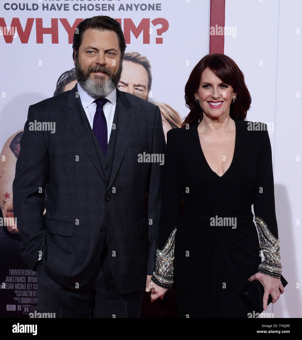 Membro del cast Megan Mullally e suo marito, attore Nick Offerman assistere alla premiere di Motion Picture commedia "perché lui?" al Regency Bruin Theater di Westwood sezione di Los Angeles il 17