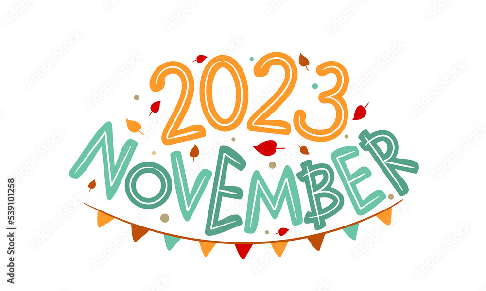 Vektorová grafika „November 2023 logo with hand-drawn autumn leaves and garland. Months emblem for the design of calendars, seasons postcards, diaries. Doodle Vector illustration isolated on white background.“ ze služby Stock |