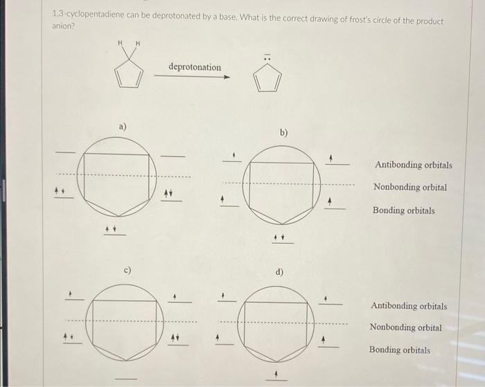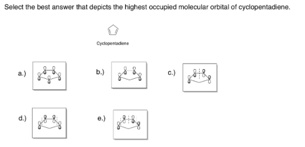 SOLVED: Select the best answer that depicts the highest occupied molecular orbital of cyclopentadiene. Cyclopentadiene a.) b.) d.)