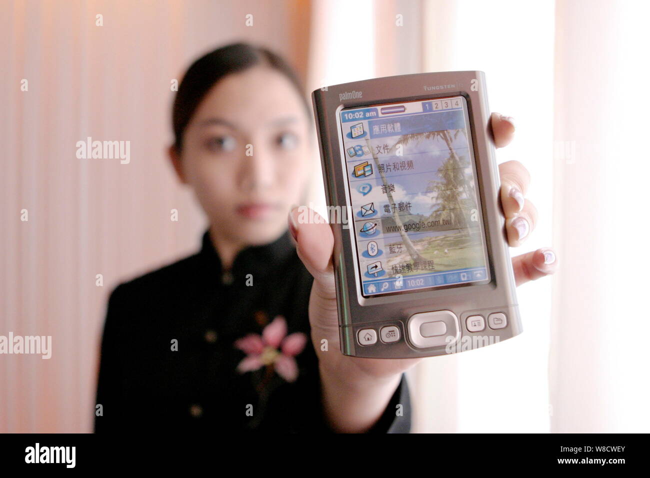 FILE--A woman shows a PalmOne Tungsten T5 PDA at a launch event in Shanghai, China, 4 November 2004. Chinese electronics maker TCL Communication T Stock Photo - Alamy
