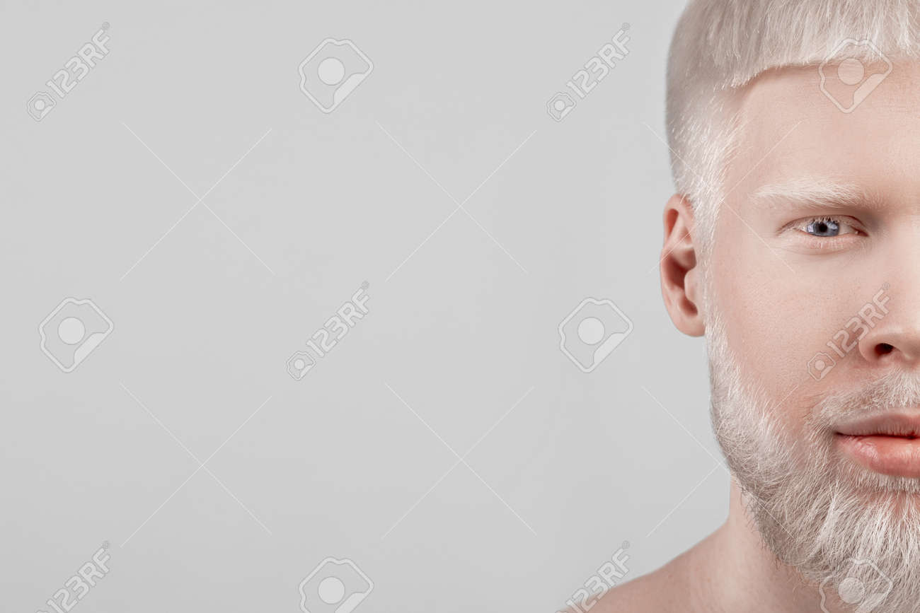 Immagini Stock - Ritratto A Metà Faccia Di Un Ragazzo Albino Con Pelle Pallida E Capelli Bianchi Su Sfondo Grigio Chiaro, Spazio Libero. Image 166149531