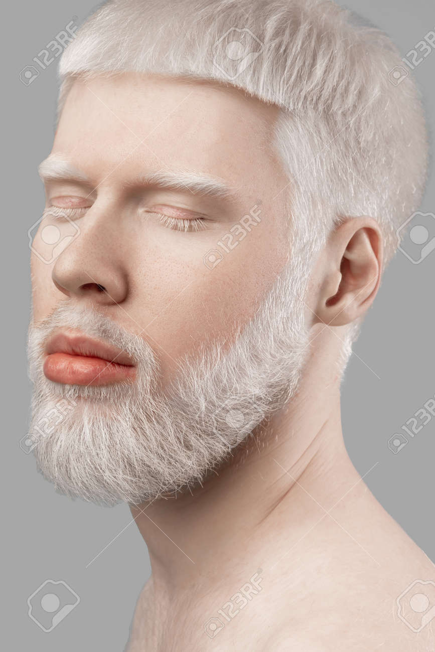 Immagini Stock - Ritratto Di Giovane Albino Con Occhi Chiusi, Capelli Bianchi E Pelle Pallida In Posa Su Sfondo Grigio Studio, Raccolto, Primo Piano. Image 167061736