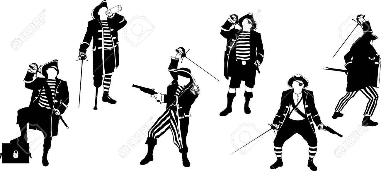 SVG, Vettoriale - Una Piccola Serie Di Sagome Di Capitani Pirati In Diverse Situazioni Con Armi Che Riposano E Trovano Tesori Su Sfondo Bianco. Image 170634405