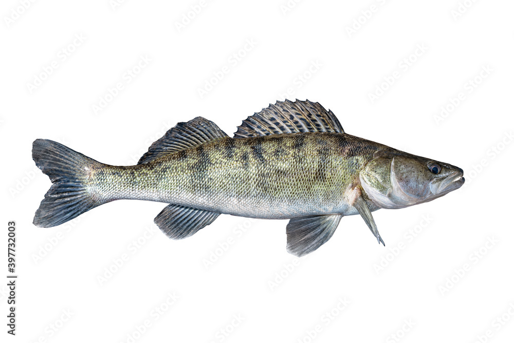 Foto Stock Zander. Walleye live fish isolated on white background. Sander pikeperch fishing | Adobe Stock