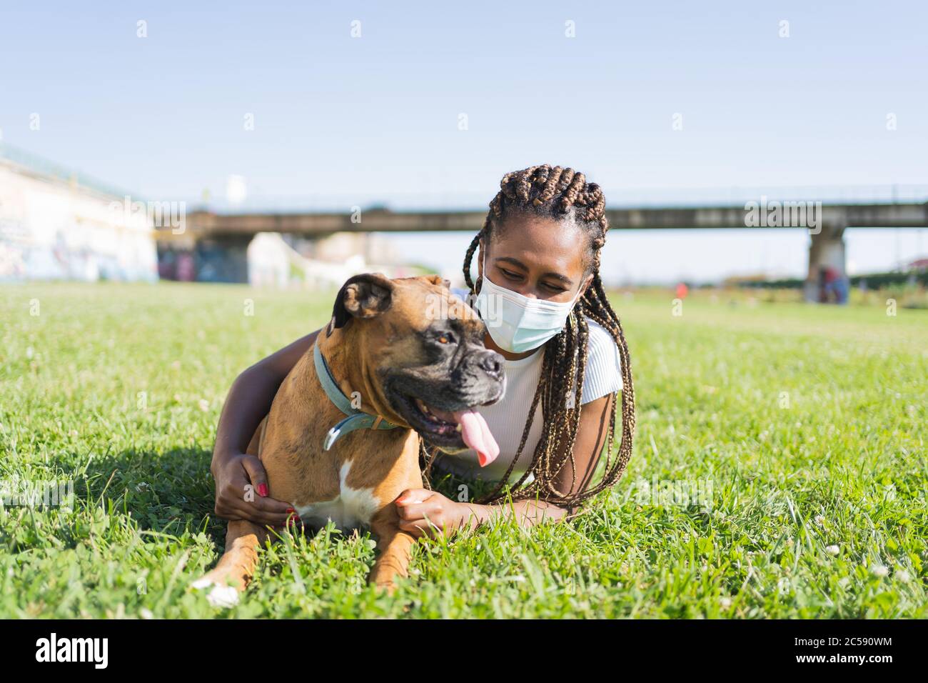 Young Informal Woman With Piercings And Pigtails Walks In The Park With Her Dog, Black Pit Bull On A Walk Stock Photo, Picture And Royalty Free Image. Image 159577123.
