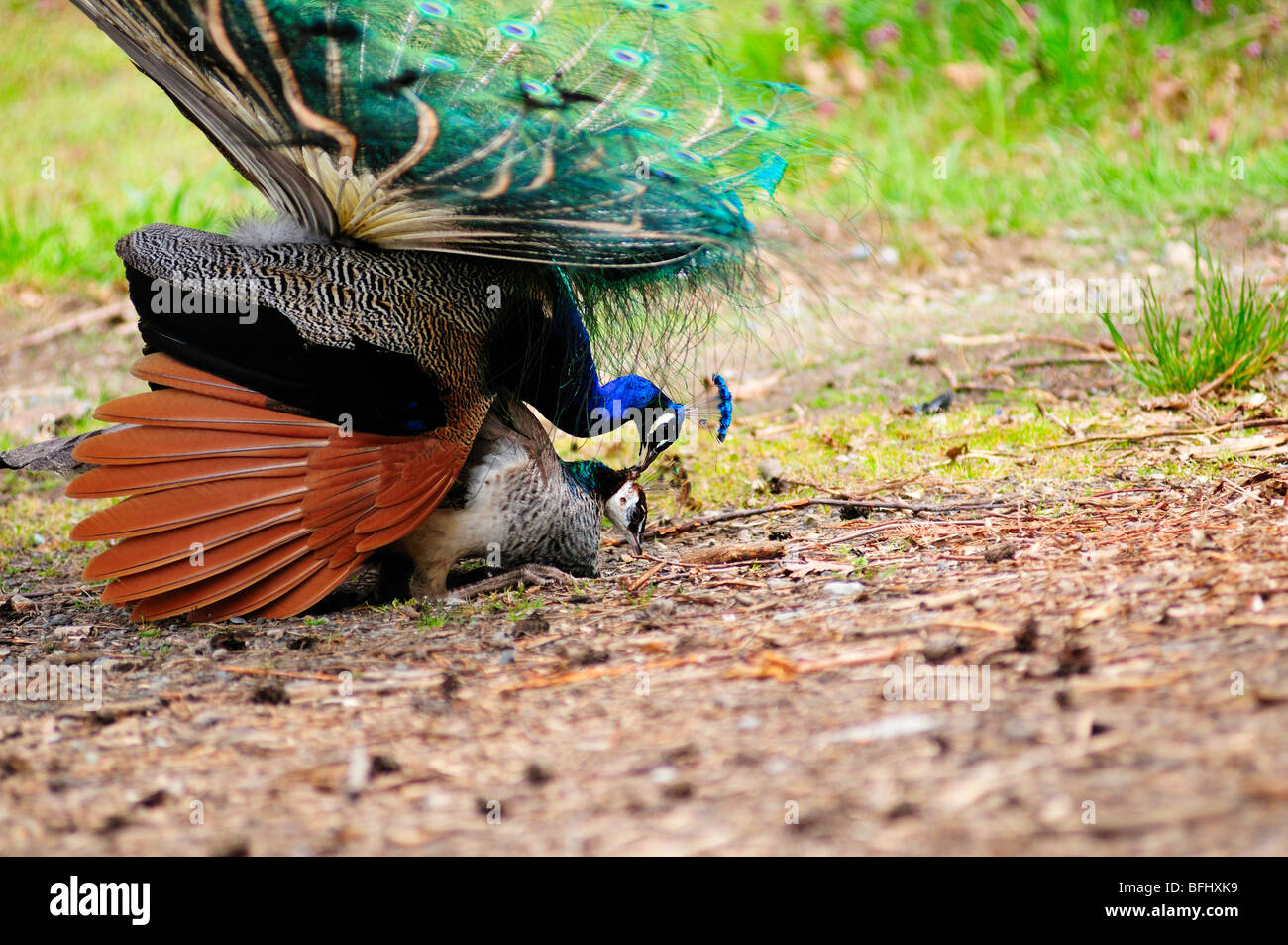 Uccello Pavone Maschio Pavo Cristatus Con Piume Della Coda A Mostra Completa Con Femmina In Background Che Non Presta Attenzione - Fotografie stock e altre immagini di Accoppiamento animale - iStock