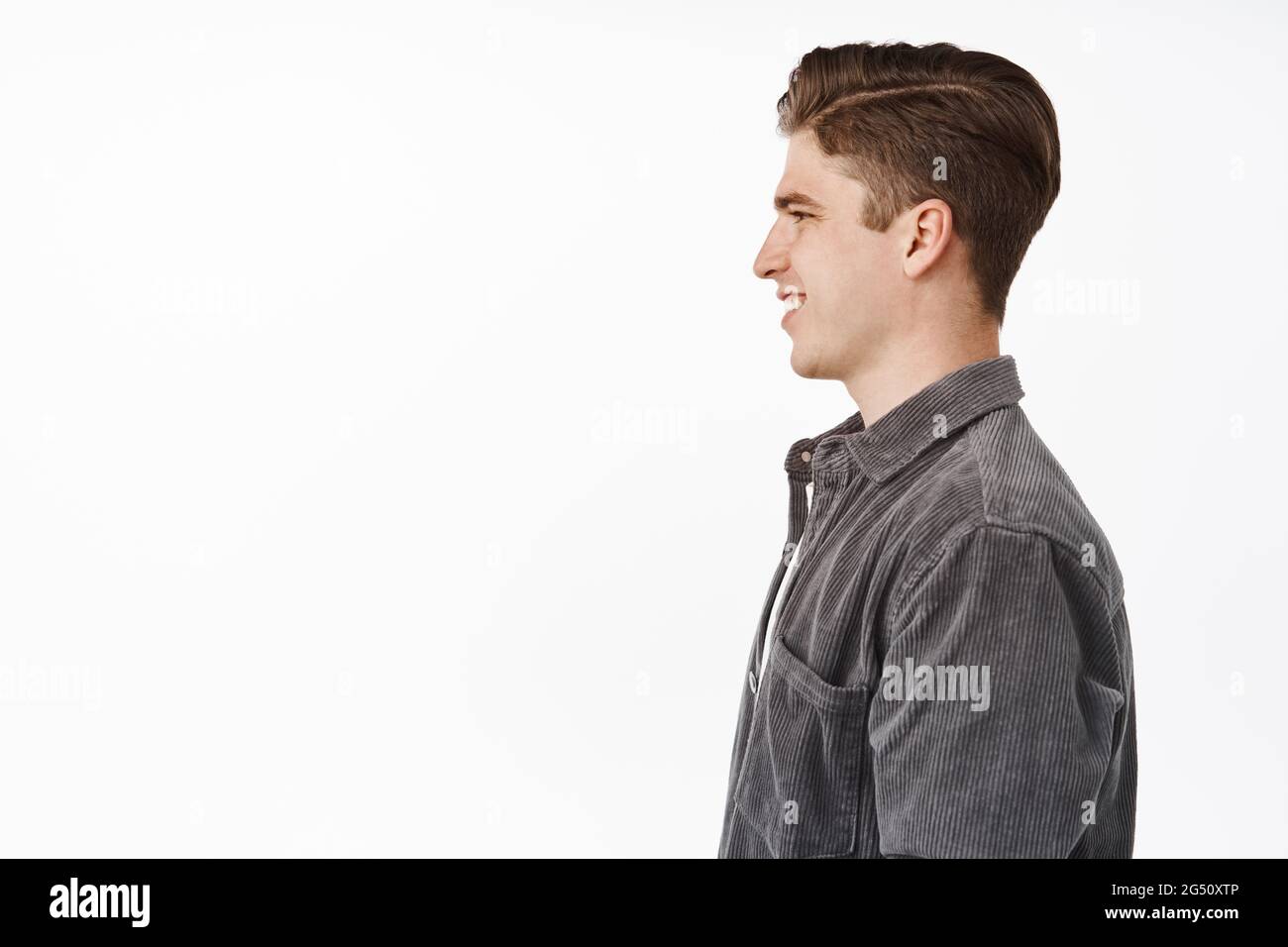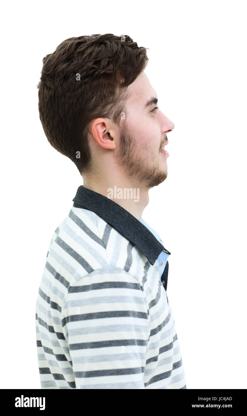 Profilo ritratto di giovane bell'uomo, ragazzo con pulito senza acne faccia, un lato, guarda a sinistra e sorride felice e soddisfatto, in piedi contro bianco Foto stock - Alamy
