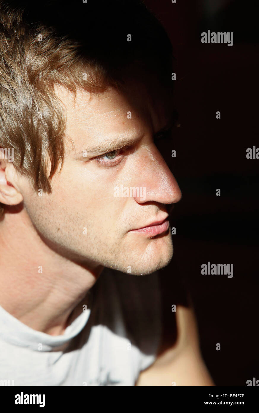 Profile view of face of young man wearing vest Stock Photo - Alamy