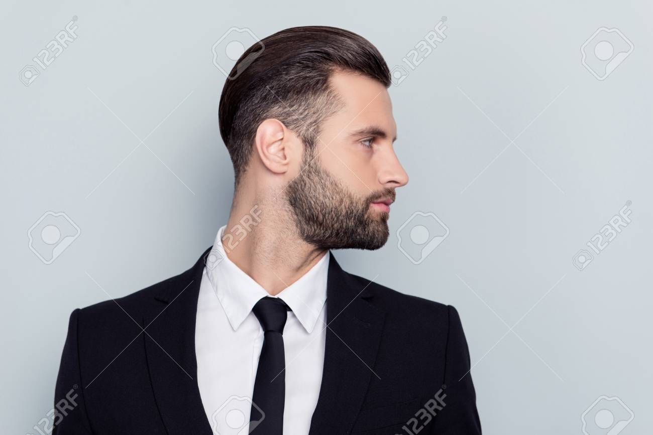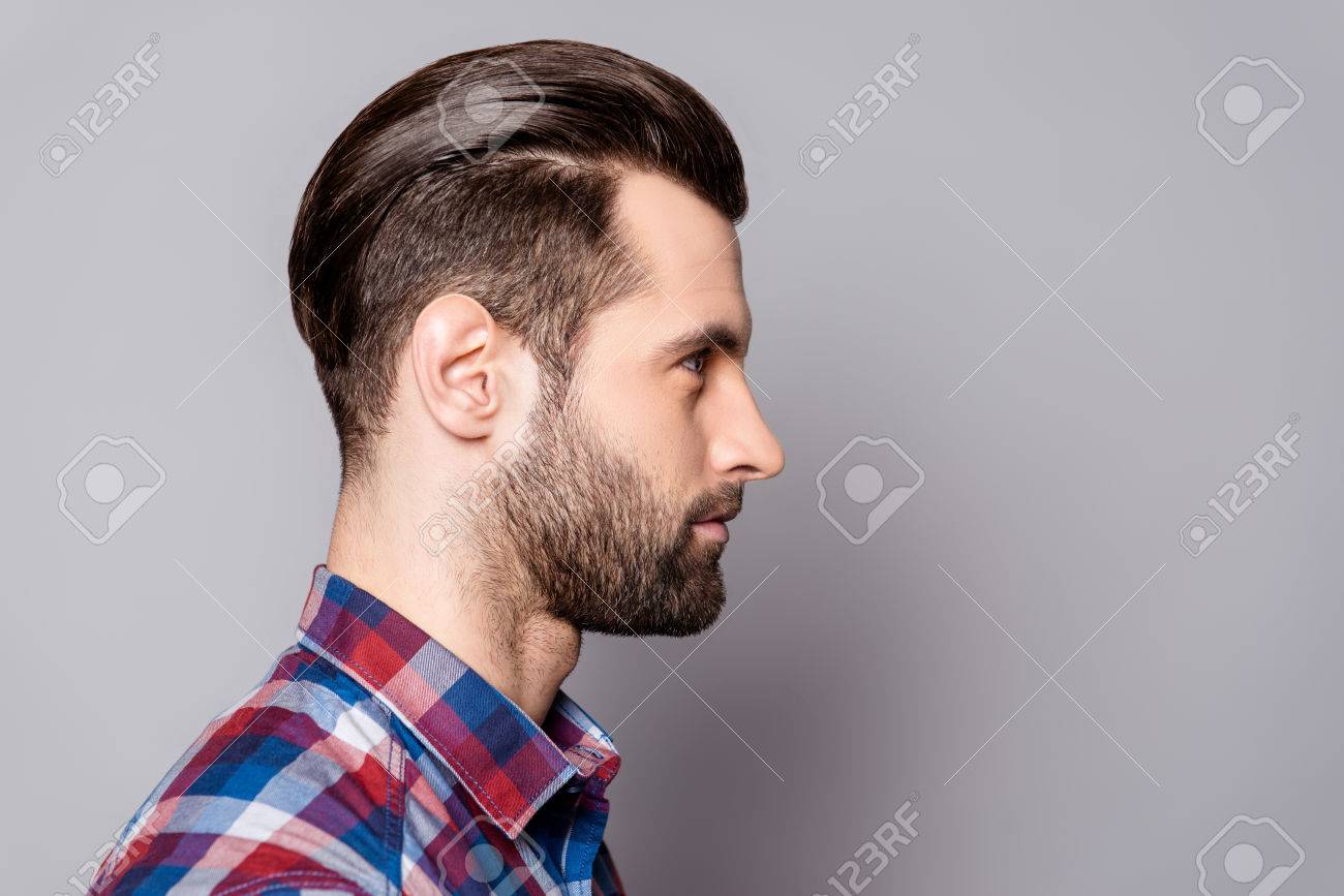 Advertisement Concept, Side View Half Face Profile With Copy Space Of Perfect Man Standing Over Gray Background Stock Photo, Picture and Royalty Free Image. Image 103933450.