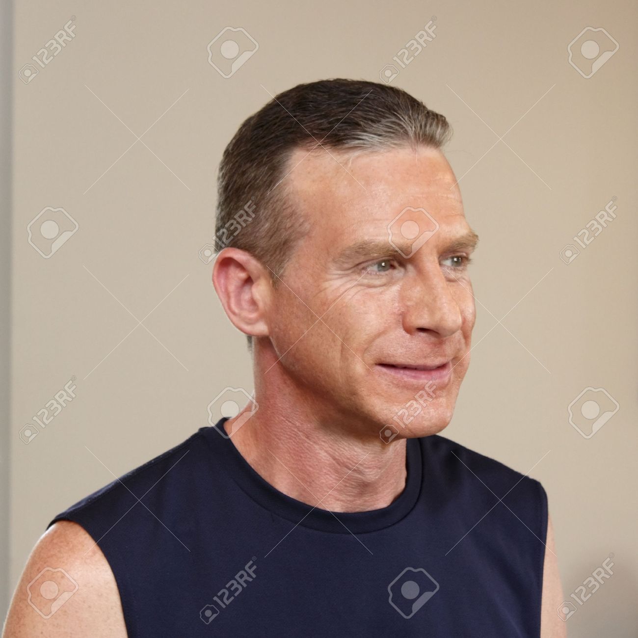 Immagini Stock - Faccia Profilo Metà E Parte Superiore Del Corpo Di Uomo Adulto Indoeuropea Sulla Quarantina Che Osserva Fuori Al Lato Vestito Con Una Camicia Blu Scuro Senza Maniche Sportiva Di