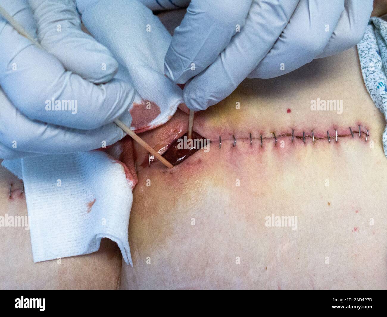 Svuotamento pus infettati da ferita chirurgica. Medico aprendo la pelle intorno a una ferita chirurgica per drenare il pus da la somministrazione per via sottocutanea di una infezione della ferita dopo il