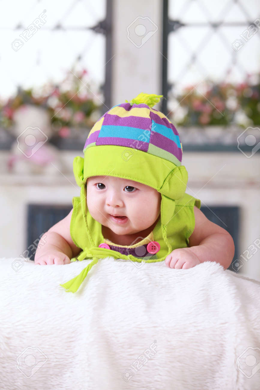 Immagini Stock - Happy Cute A 3 Mesi Di Età Bambino Cinese Ragazzo Che Gioca Sul Letto Con Suite Colorate. Image 60827877