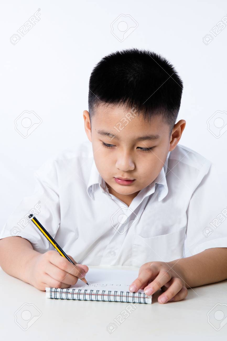 Immagini Stock - Asian Ragazzino Che Porta Uniforme Student Scrivendo Homework Cinese In Modo Chiaro Sfondo Bianco Isolato.. Image 63990759
