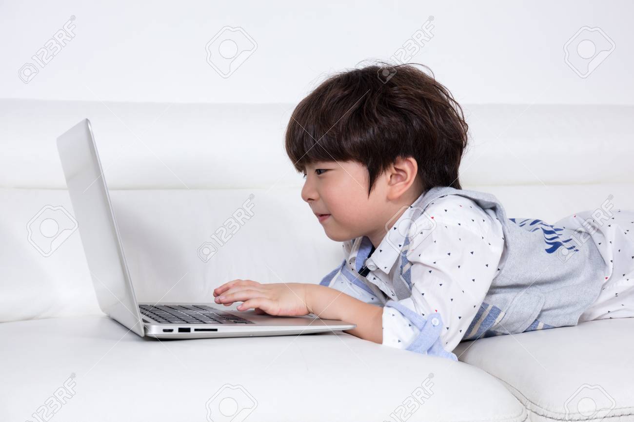 Immagini Stock - Ragazzino Cinese Asiatico Felice Che Gioca Computer Portatile Sullo Strato Nel Salone A Casa. Image 74538725.