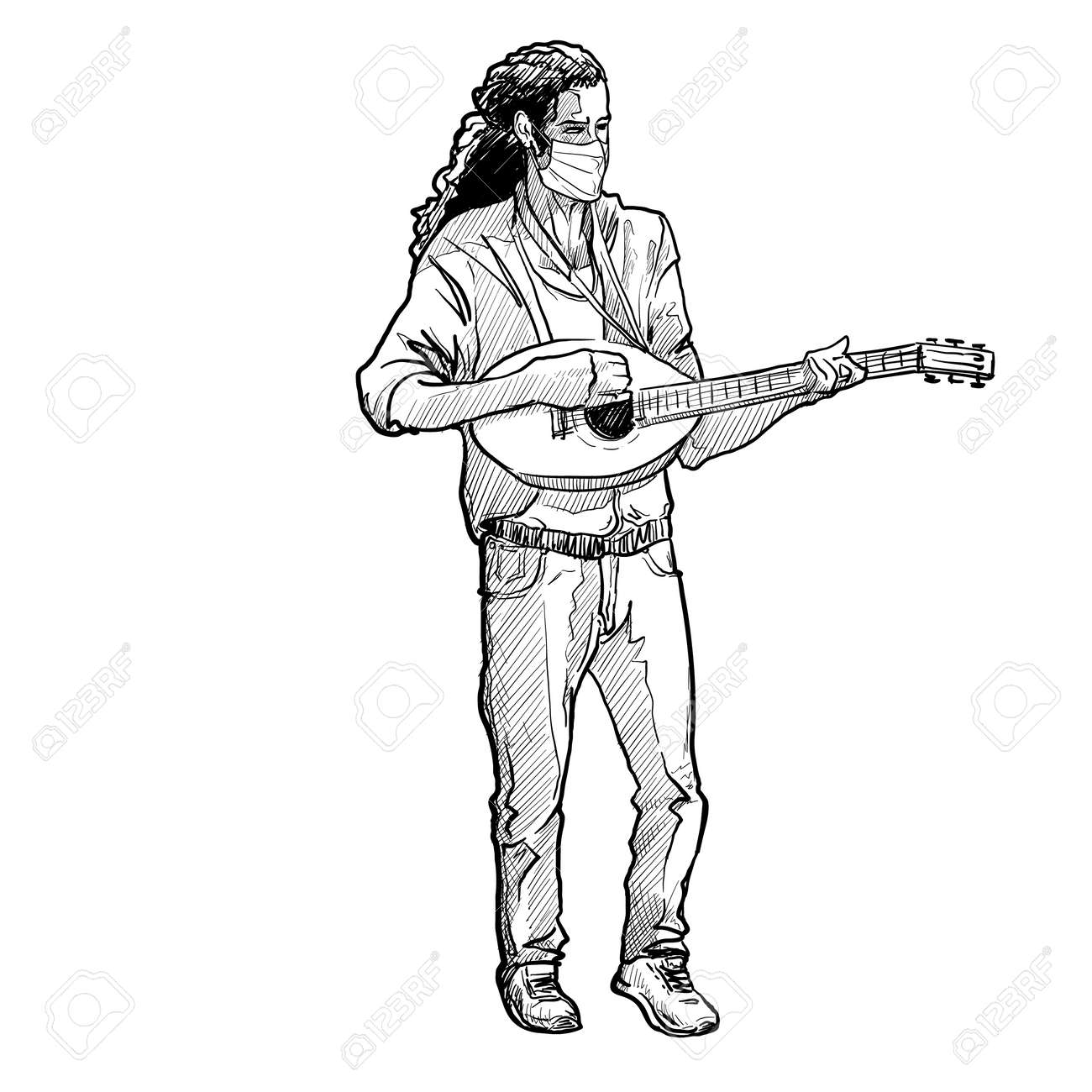 SVG, Vettoriale - Giovane Uomo Bianco Che Indossa Una Maschera Medica Di Protezione Mentre Suona Il Mandolino. Vista Frontale Di Tutto Il Corpo. Pandemia Covid-19. Disegno In Stile Schizzo Lineare Isolato Su
