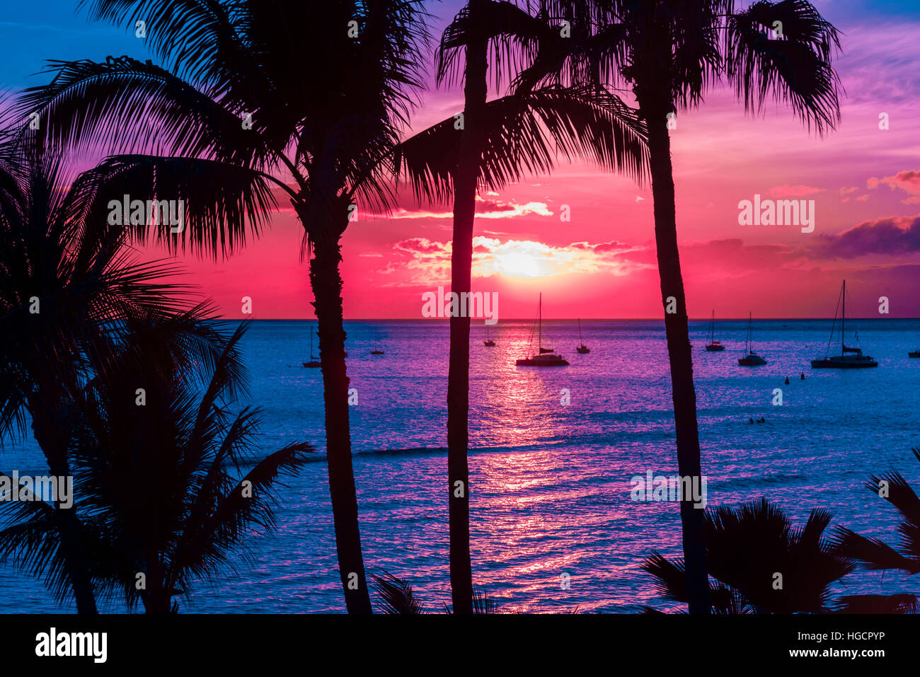 Hawaii Rosa tramonto con palme Foto stock - Alamy