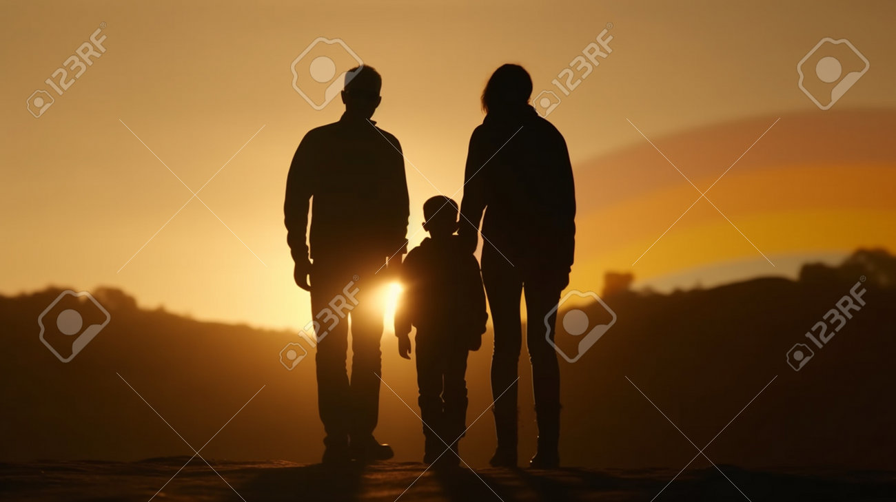 Immagini Stock - Felice Giorno Del Papà. Sagoma Di Una Famiglia Al Tramonto. Padre, Madre E Figlio Che Camminano Nel Parco. Ai Generativo. Image 203310484