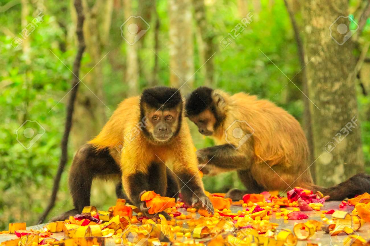 Immagini Stock - Scimmie Cappuccine Tufter O Brown. Due Scimmie Che Mangiano Frutta Nella Foresta, Specie Cebus Apella Che Vivono In Sud America, Tra Colombia E Venezuela, Nella Foresta Pluviale Amazzonica Meridionale..