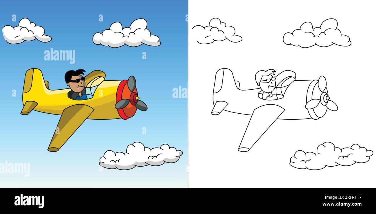 Foglio da colorare di un ragazzo alla guida di un aereo. adatto per le attività dei bambini 8653297 Arte vettoriale a Vecteezy