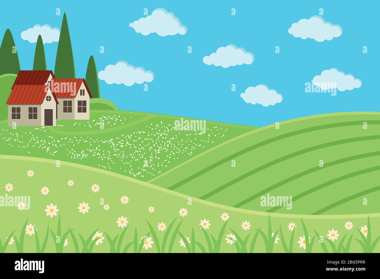 Paesaggio rurale fattoria con case. Estate paesaggio di campagna sfondo con campi verdi, prato, villaggio, nuvole, erba, fiori, alberi, cielo blu Immagine e Vettoriale - Alamy