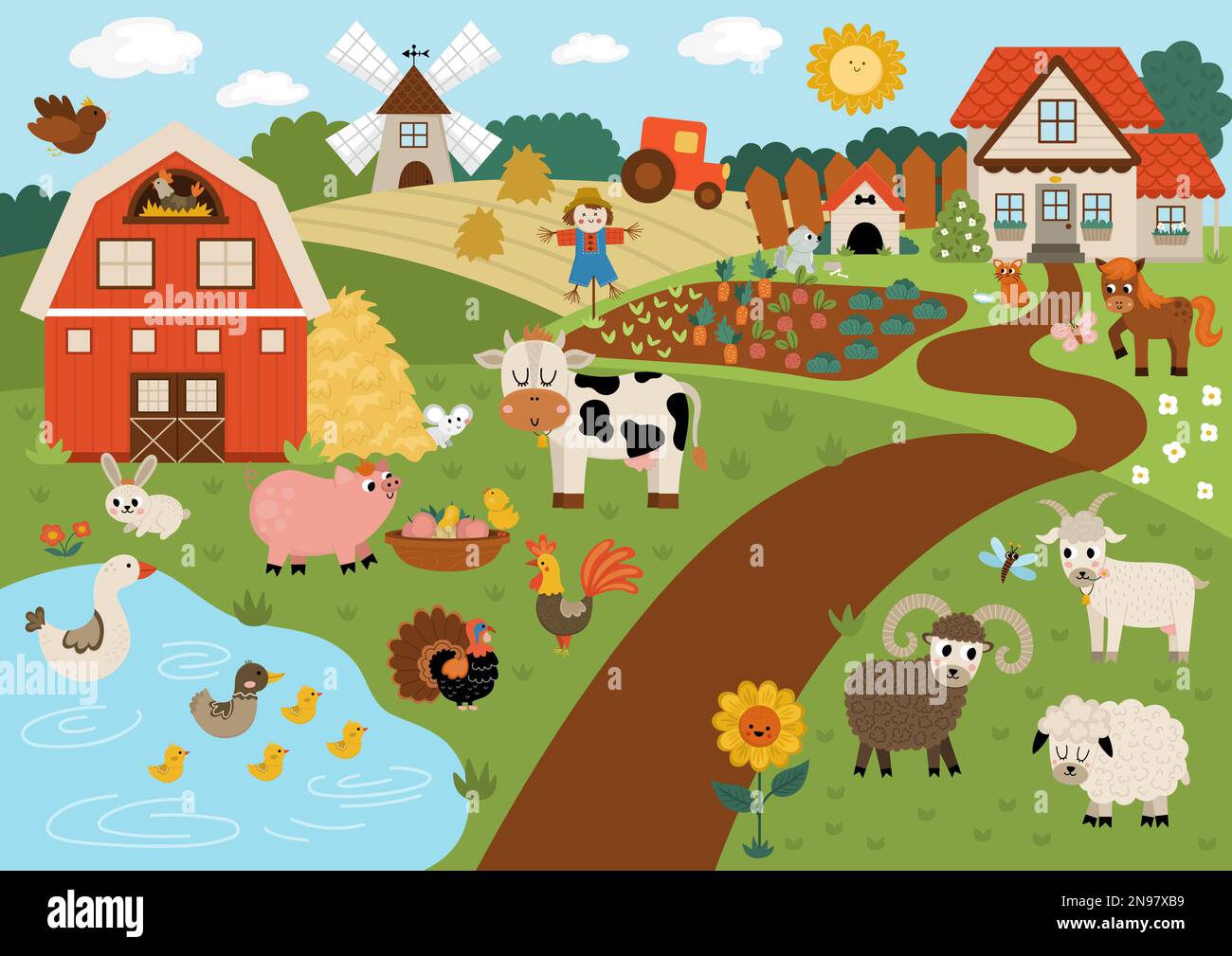 Illustrazione orizzontale di una fattoria vettoriale. Villaggio rurale scena con animali, fienile, casa di campagna. Cute primavera o estate sfondo natura con stagno, prato Immagine e Vettoriale - Alamy