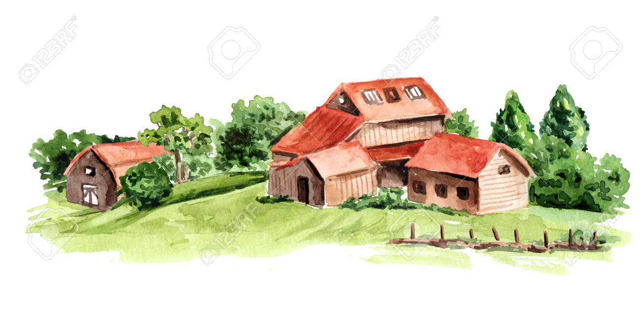 Immagini Stock - Vecchia Fattoria In Campagna, Illustrazione Disegnata A Mano Ad Acquerello Isolata Su Sfondo Bianco. Image 159207741