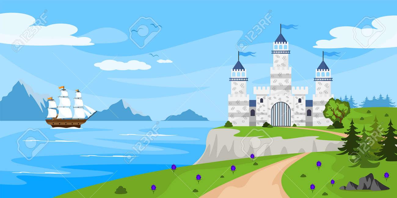 SVG, Vettoriale - Illustrazione Vettoriale Di Un Bellissimo Castello. Paesaggio Dei Cartoni Animati In Riva Al Mare Con Castello Bianco, Nave, Montagne Sullo Sfondo. La Principessa Vive Nel Castello.. Image 189784941