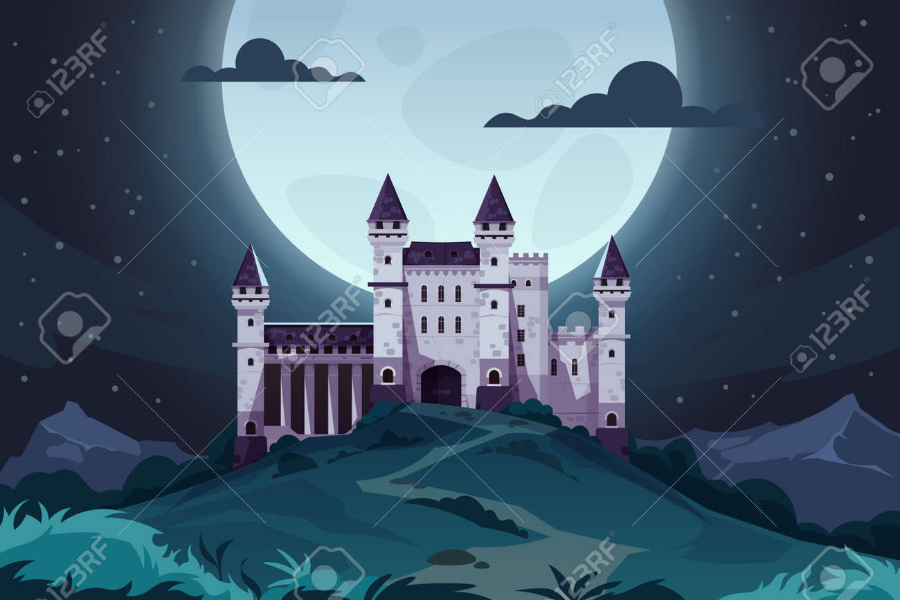 SVG, Vettoriale - Castello Dei Cartoni Animati Serali. Fortezza Medievale Da Favola Di Notte, Paesaggio Magico Con Palazzo Reale. Scena Della Capitale Del Regno Vettoriale. Image 186200552