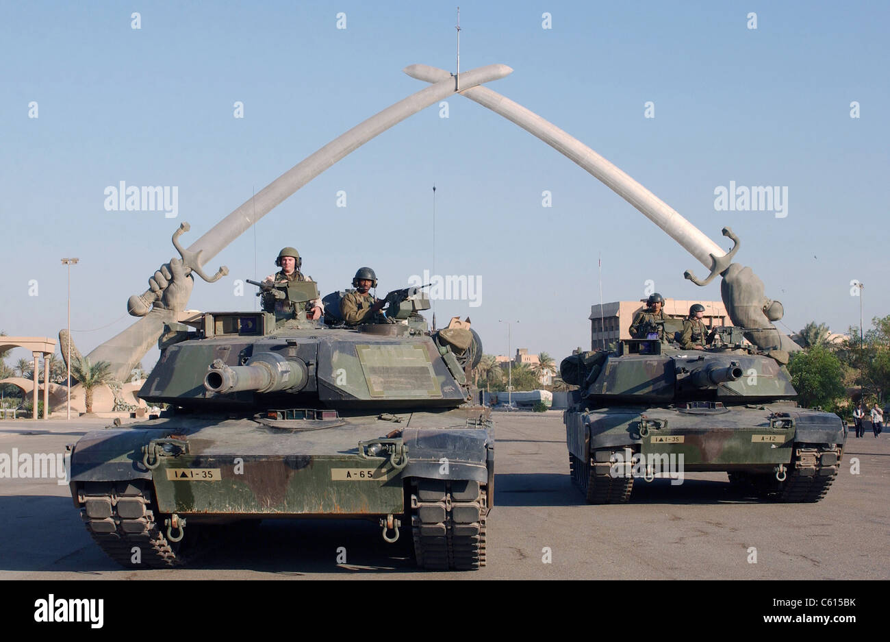 I soldati in un esercito Abrams serbatoio posano per una foto sotto il "Mani di Vittoria" Cerimonia in piazza a Bagdad in Iraq. Il monumento commemorativo della guerra Iran-Iraq 1980-88 è modellato
