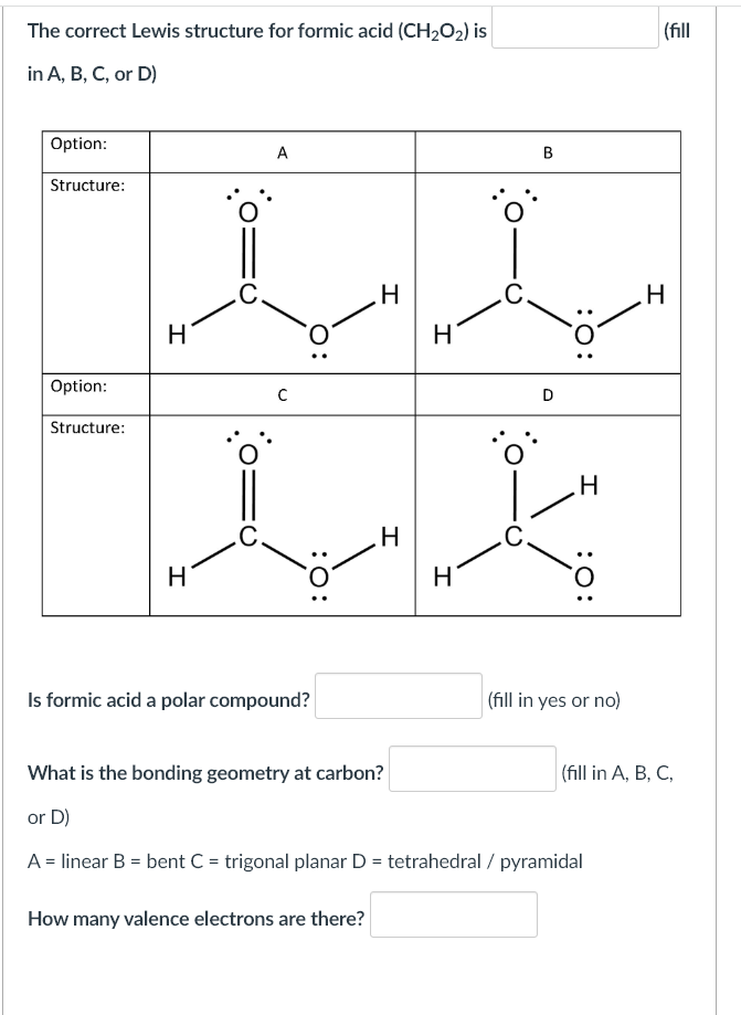 Solved The correct Lewis structure for formic acid (CH2O2) | Chegg.com