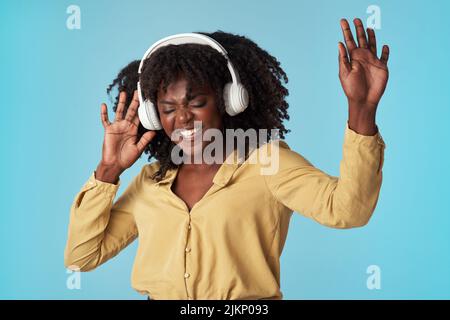 Ascoltare i ritmi: Donna che balla al telefono con le cuffie in salotto. Donna felice ballare mentre ascolta musica su smartphone con lui Foto stock - Alamy