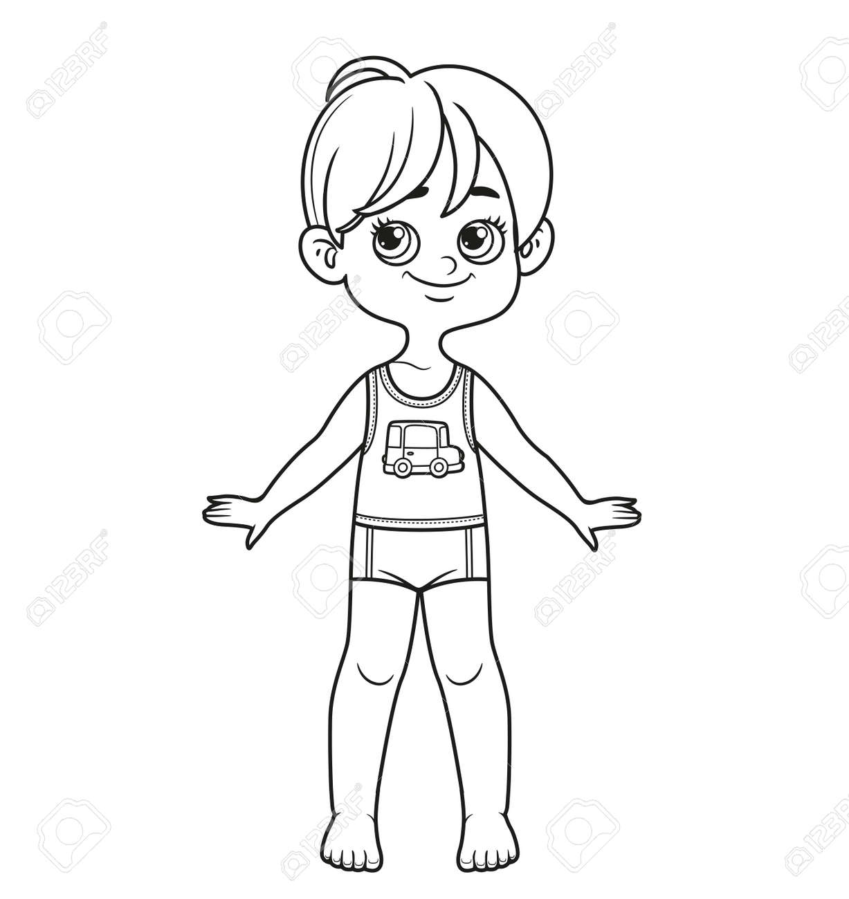SVG, Vettoriale - Ragazzo Simpatico Cartone Animato Con Taglio Di Capelli Classico Vestito In Mutande A Piedi Nudi Per La Colorazione Su Sfondo Bianco. Image 188223649