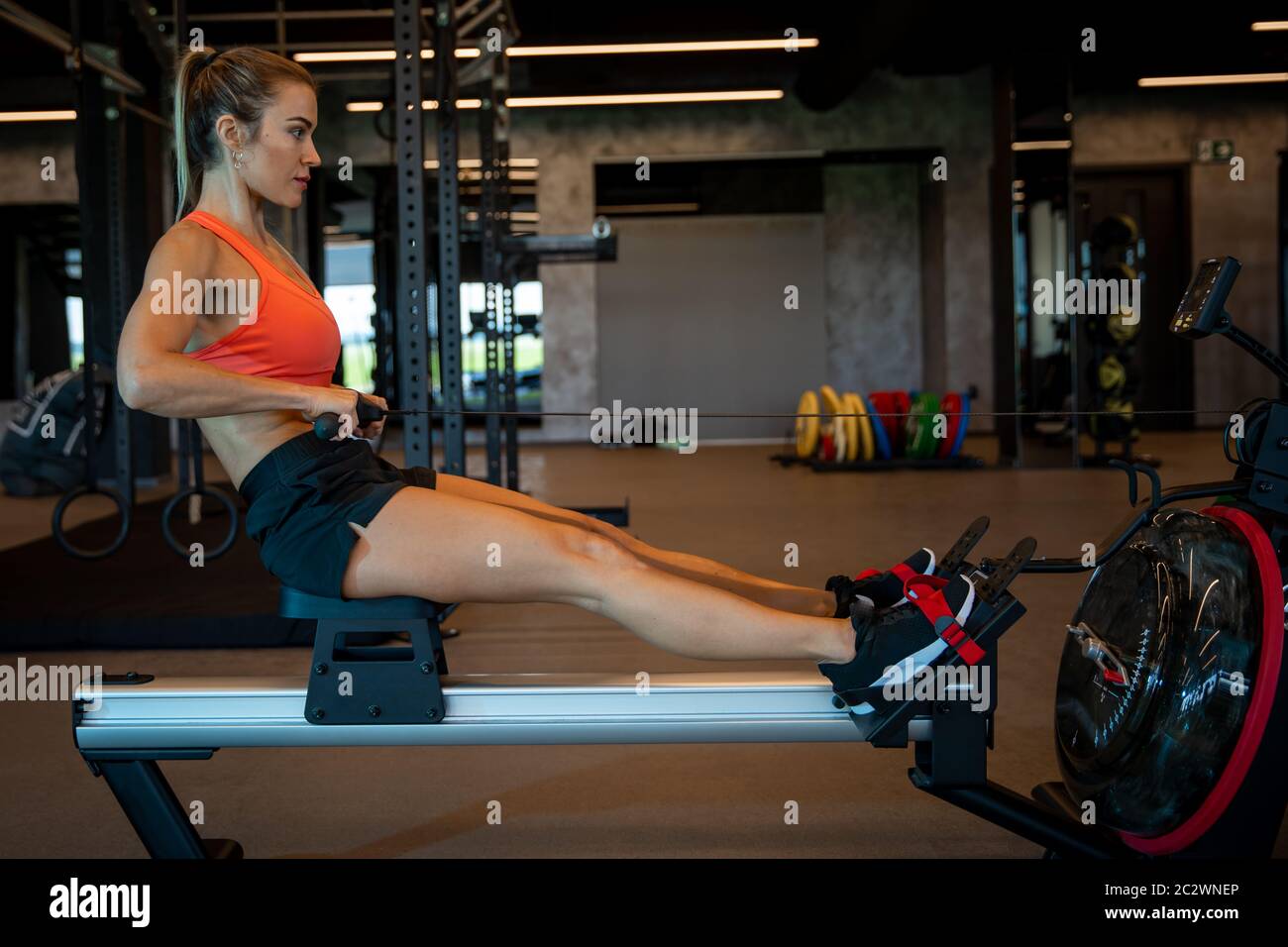 Tirare la puleggia sulla vogatrice per rinforzare i muscoli ...