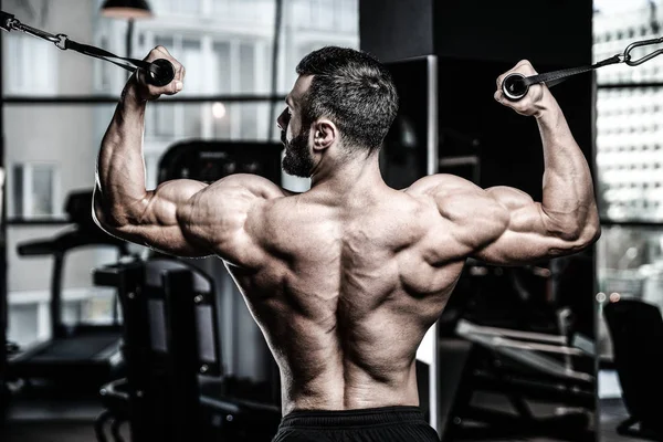 Brutale forte bodybuilder uomo pompaggio muscoli e treno palestra ...