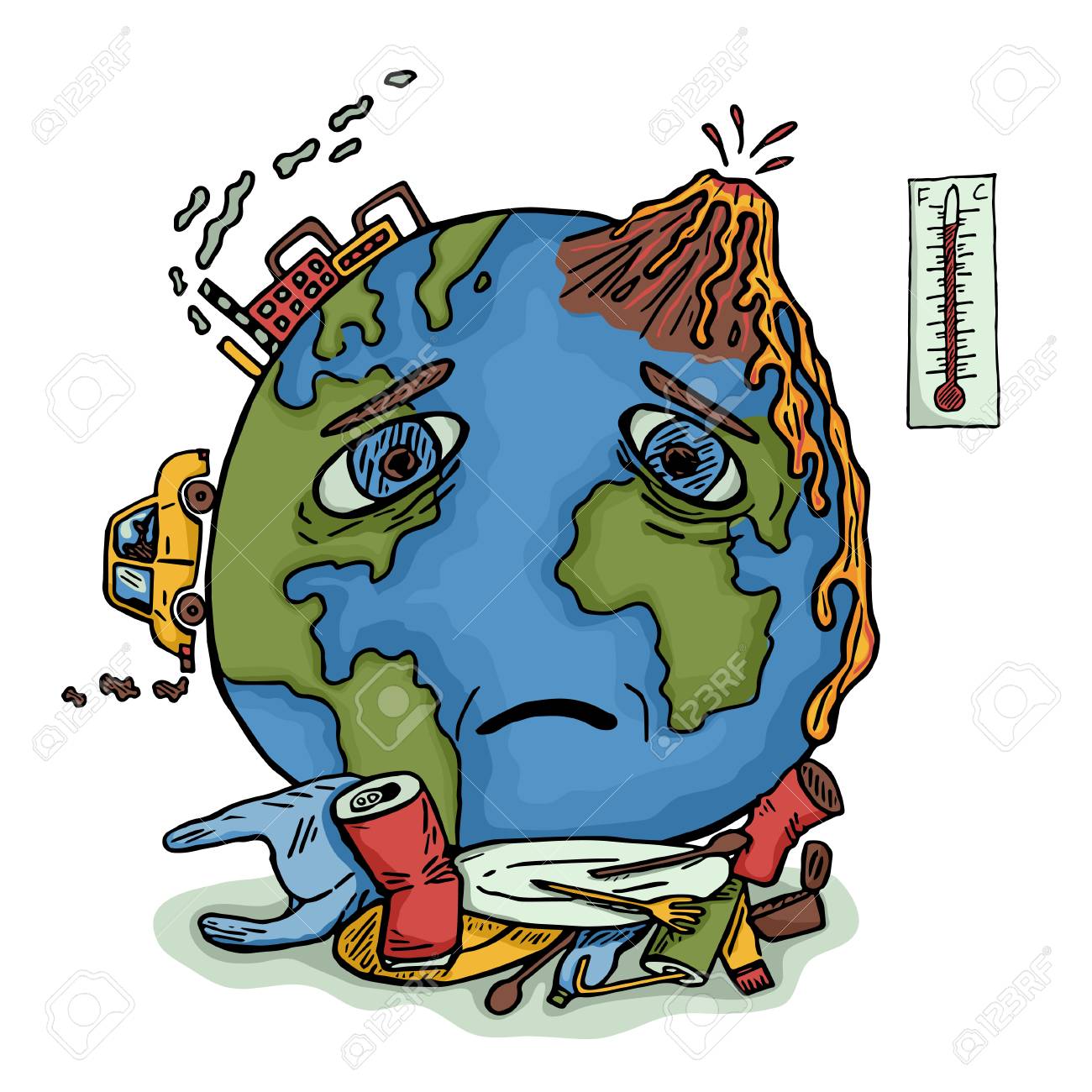SVG, Vettoriale - Pianeta Terra Disegnato A Mano Con Faccia Triste. Concetto Ecologico Di Riscaldamento Globale E Inquinamento. Illustrazione Vettoriale A Colori. Image 112343940