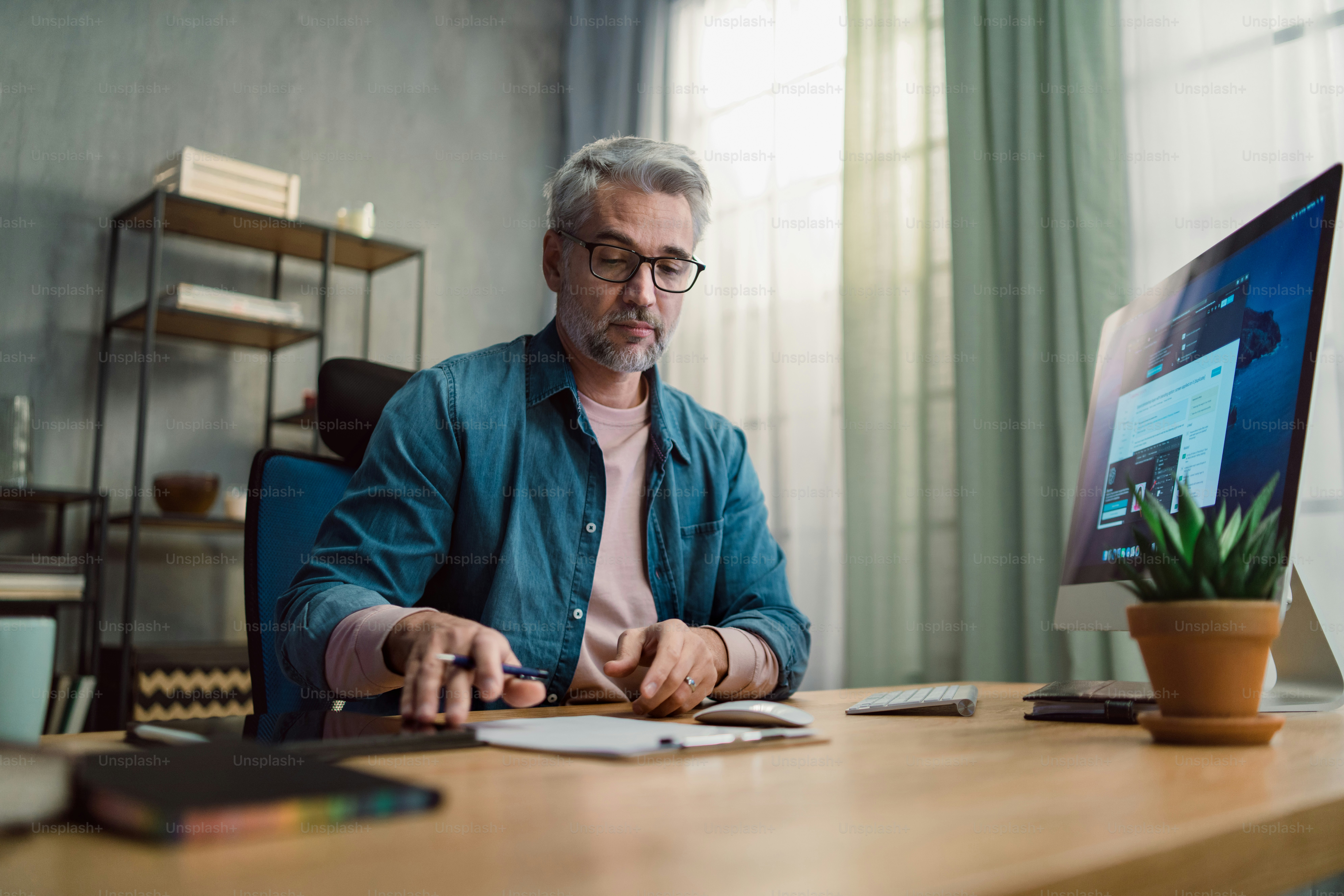 Un architetto uomo maturo che lavora al computer alla scrivania al chiuso in ufficio. foto – Scrivania Immagine su Unsplash