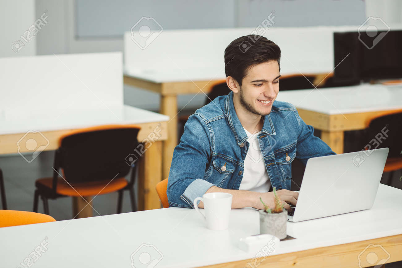 Immagini Stock - Giovane Uomo Con La Barba Che Lavora Al Computer Portatile. È Seduto In Ufficio Sul Lato Destro Della Sua Scrivania. Felice Ragazzo Sta Chattando Con I Partner Intorno Alla
