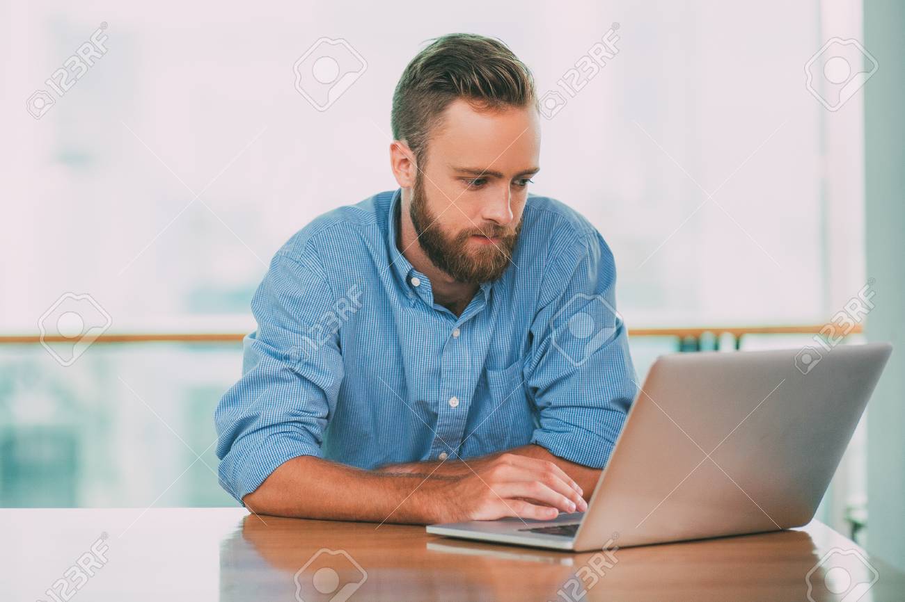 Immagini Stock - Uomo Barbuto Messo A Fuoco Che Lavora Al Computer Portatile In Caffè. Image 77373710
