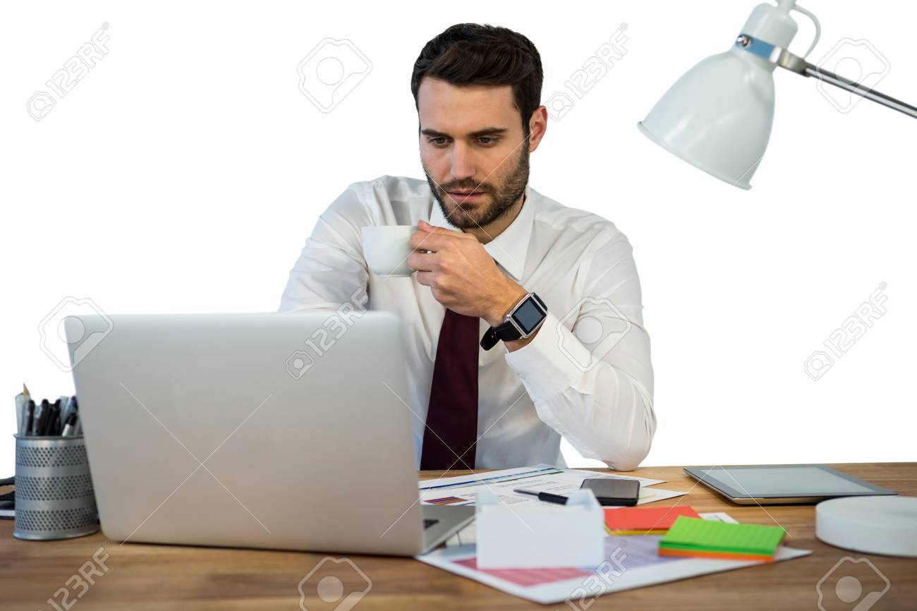 Businessman Working On Laptop In Office While Having Coffee Against White Background Stock Photo, Picture and Royalty Free Image. Image 64382542.