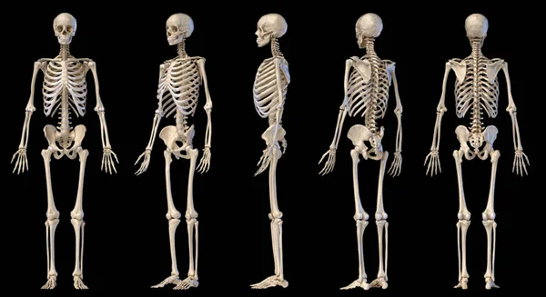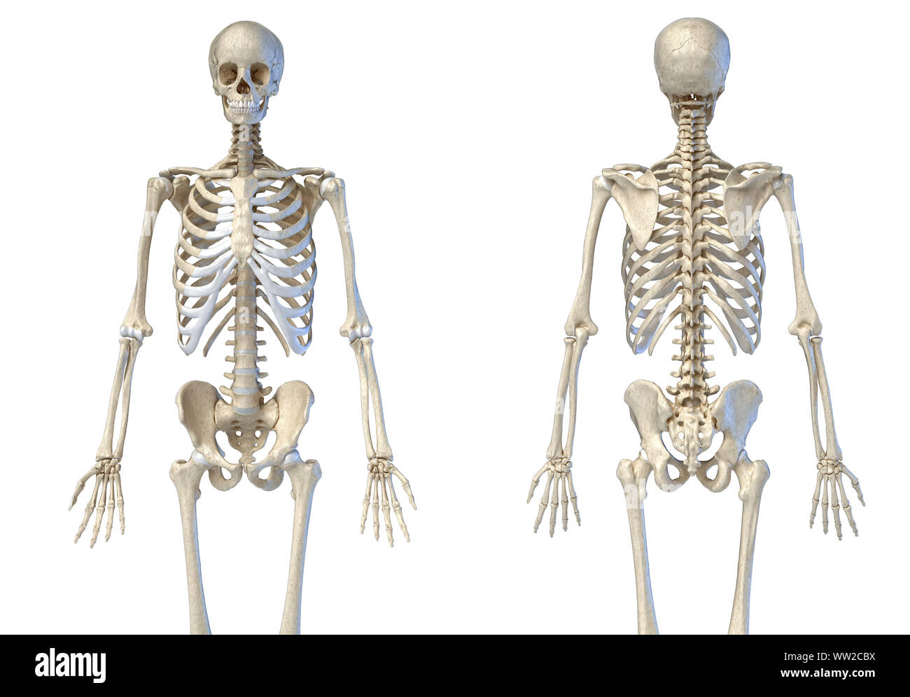 Maschio dello scheletro umano, due viste frontali e posteriori. Scientificamente corretta, realistiche del rendering 3D. Percorso di clipping incluso Foto stock - Alamy