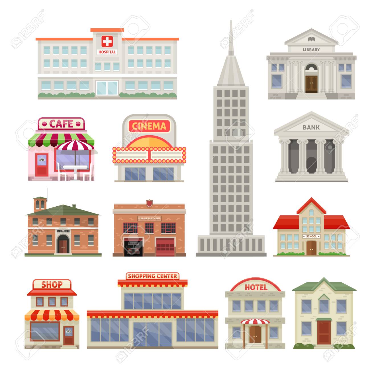 SVG, Vettoriale - Le Icone Decorative Delle Costruzioni Della Città Hanno Messo Con Il Caffè Dell'hotel Amministrativo E Residenziale Delle Costruzioni E L'illustrazione Di Vettore Isolata Cinema. Image 61904800