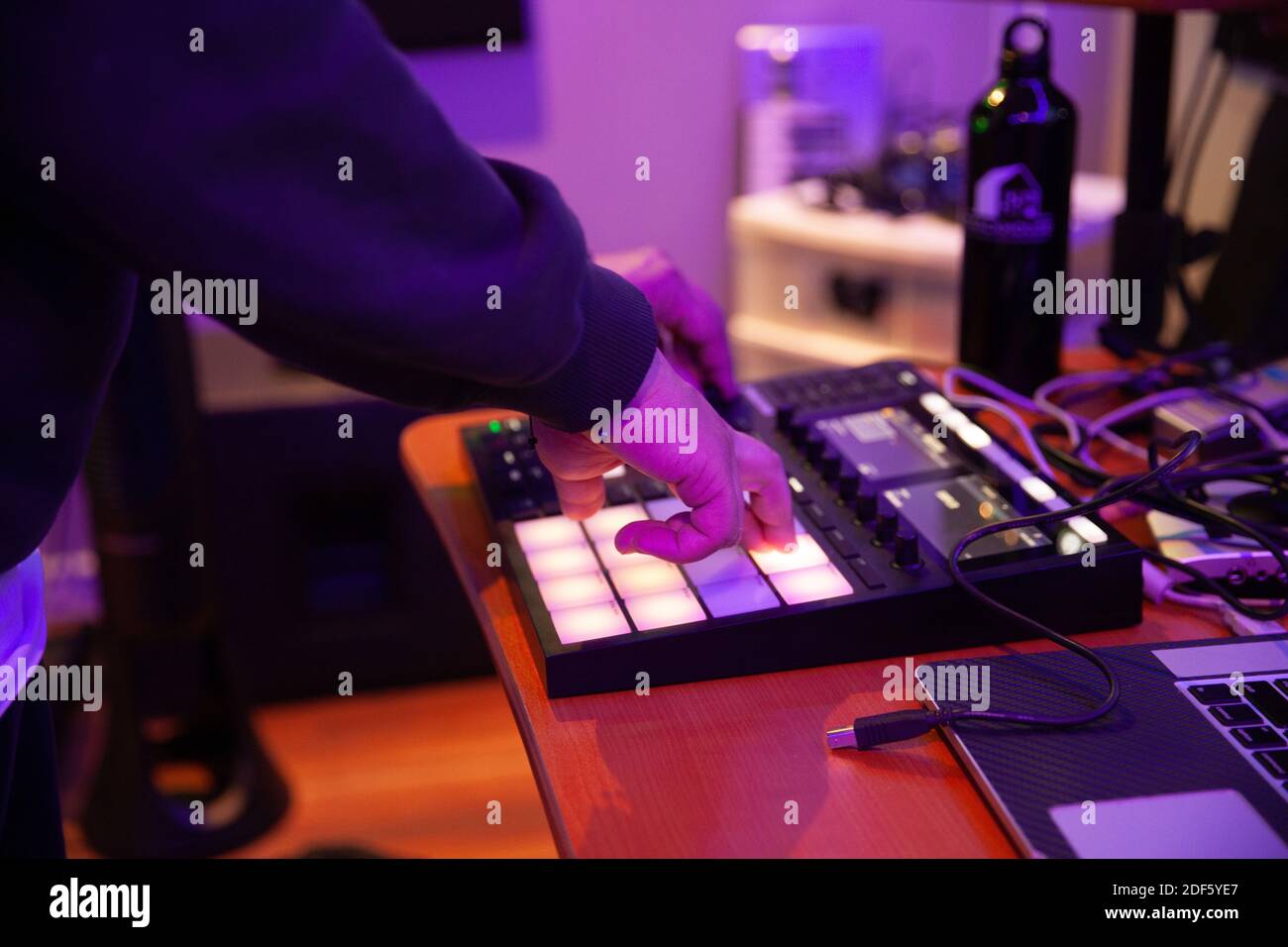 Un primo piano di un uomo che fa la musica batte e. suona con una macchina di drum pad Foto stock - Alamy