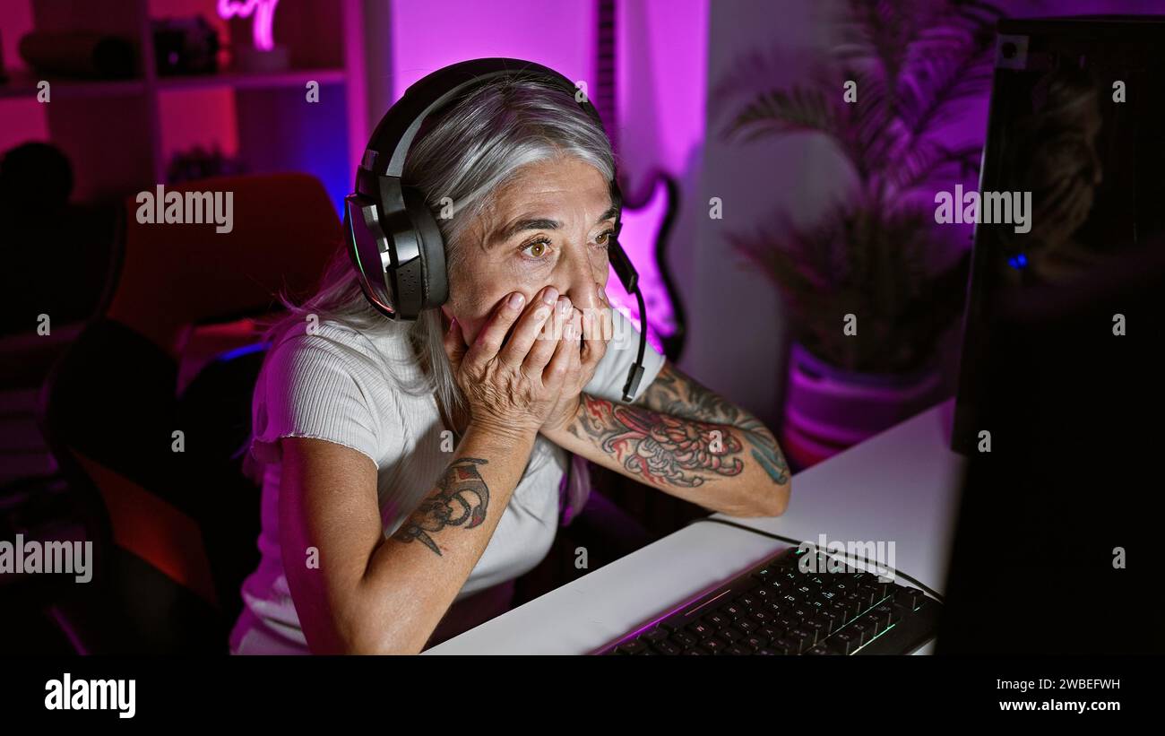 Senior bella grigio-capelli donna gamer giocare a video gioco utilizzando joystick e cuffie molto felice di puntare con la mano e le dita Foto stock - Alamy