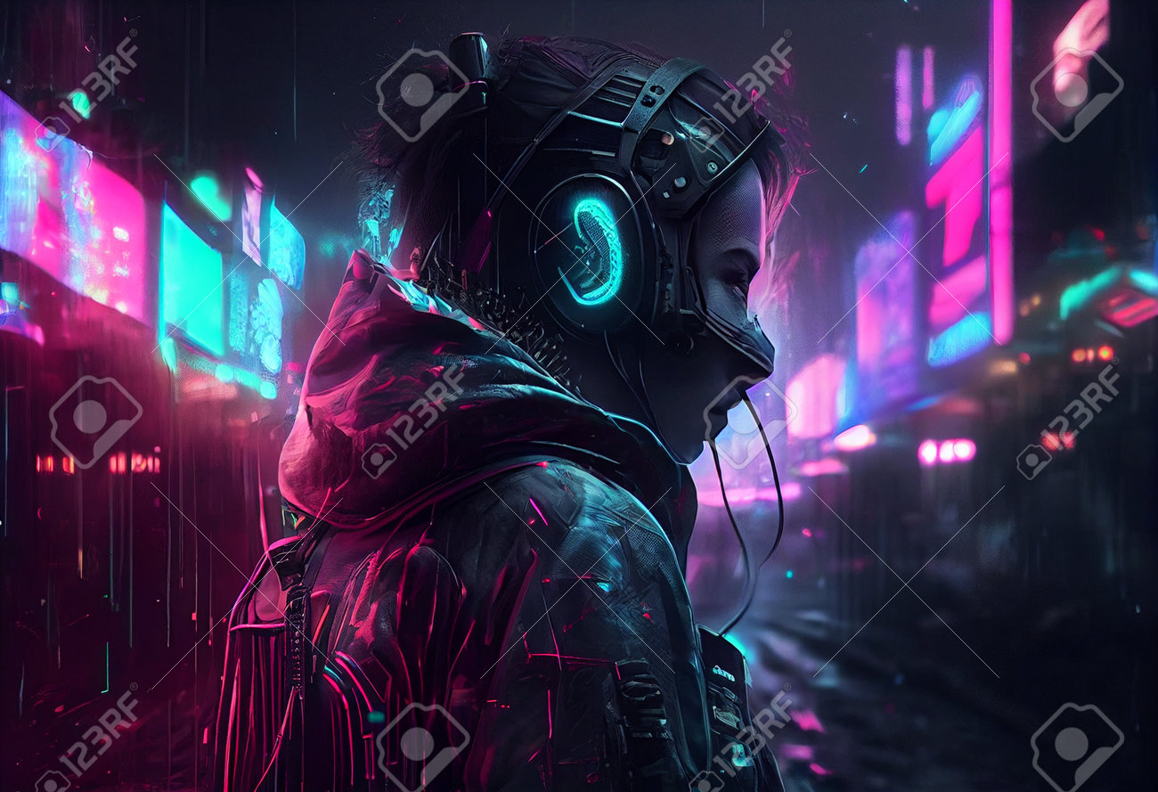 Immagini Stock - Avatar Femminile Dj In Cuffie Stile Neon Cyberpunk Ascolta Musica E Sta In Piedi Di Notte In Strada Con Luci Al Neon, Il Suono Batte Il Concetto Musicale Techno